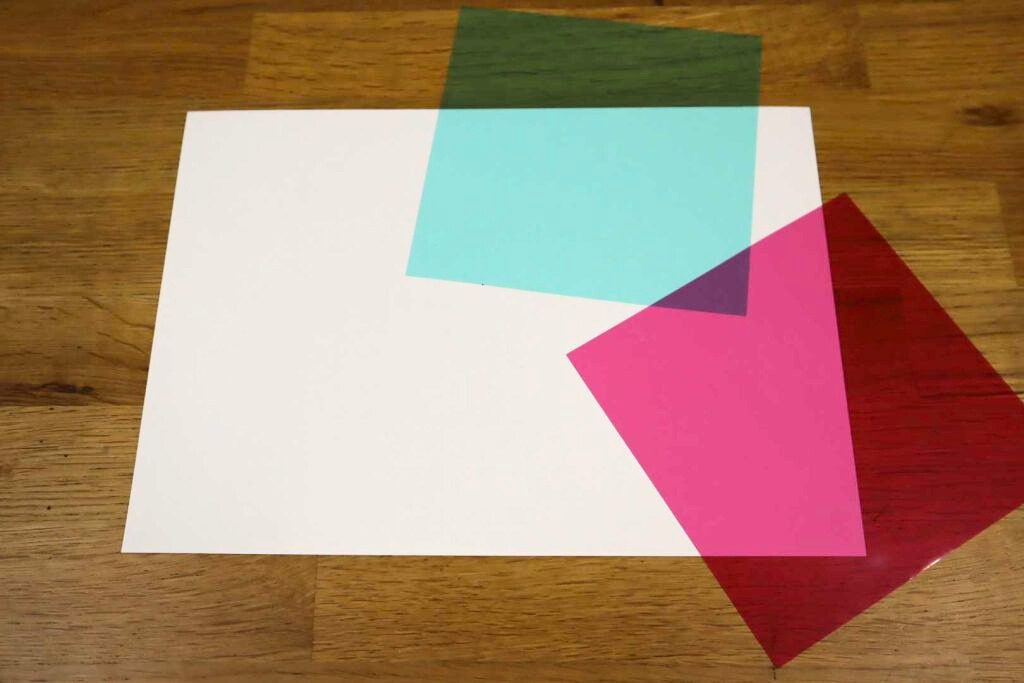 カラーセロハン色違いを2枚、白い画用紙、ペン、はさみなど