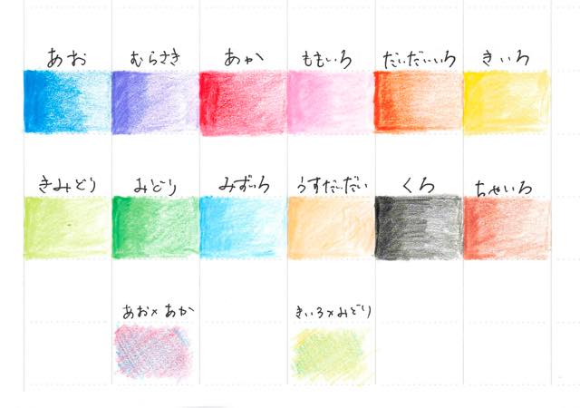 入っている色は、きいろ・きみどり・みどり・みずいろ・あお・むらさき・ももいろ・あか・だいだいいろ・うすだいだい・ちゃいろ・くろの12色