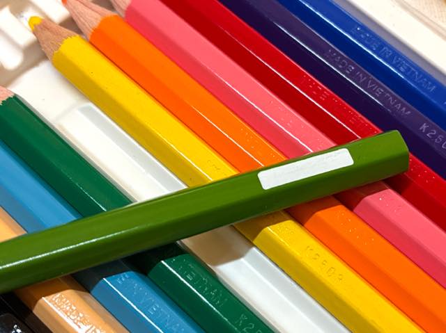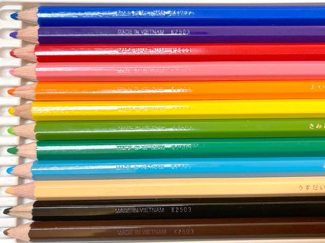 日本製の色鉛筆は大抵が丸い軸をしています。それはどの面からも均等に色が描けるように、回しながら使う意味もあるとのことでした。ですが、学校の机環境は色鉛筆を置く場所もないくらいの机の狭さ。転がり落ちることを防ぐため、2023年から六角形の軸になっているのだそうです。