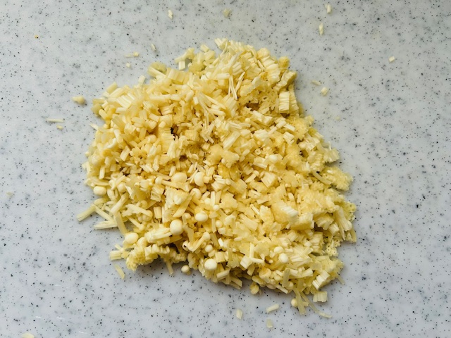 1. えのきだけは5㎜長さに切り、玉ねぎはみじん切りにする。