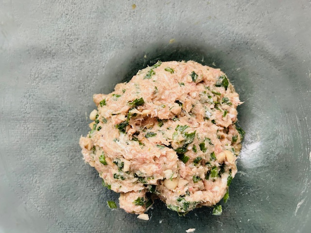 2. ボウルに豚ひき肉と①、しょうが、Aを入れて粘りが出るまで混ぜる。