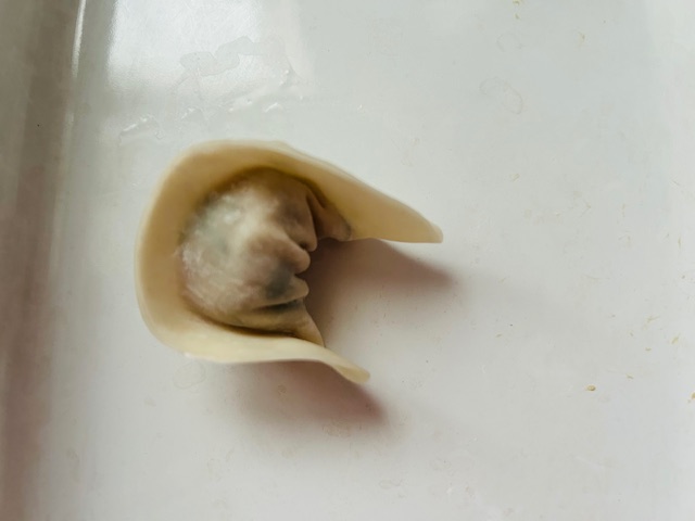 3. ②を等分にして餃子の皮で包む。皮の中央に餡をのせたら縁に水少々をつけて半分に折り、両端を合わせて水少々をつけて留める。残りも同様に作る。