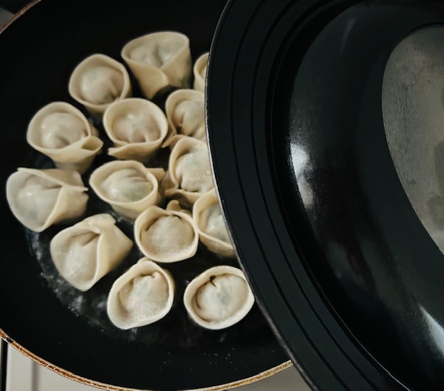 4. フライパンに油をひき、③を並べたら中火で軽く餃子の底を焼きつけ水50mlを加えて蓋をし、2~3分ほど蒸し焼きにする(水分があれば蓋をとって、水気がなくなるまで強火で焼く)。油を足して焼き目がつくまで中火で加熱する。フライパンの上に皿を置いてひっくり返し、盛りつける。
