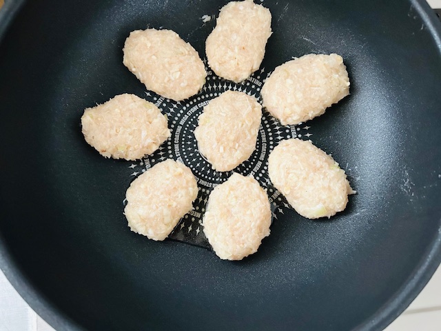 2. ボウルに鶏ひき肉と①、おろししょうが、片栗粉を入れて粘りが出るまでよく混ぜて8等分にし、小判型にする。