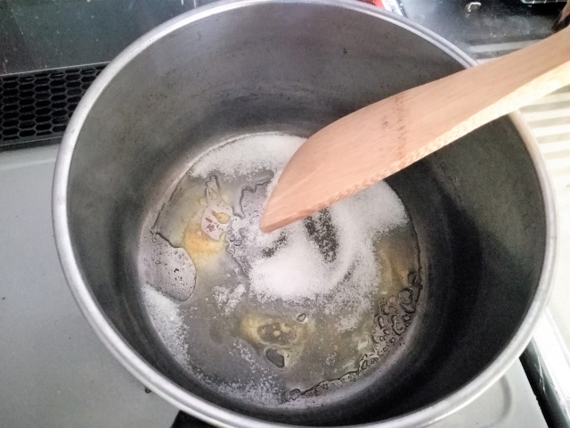 ポイントは「触らないこと」です。砂糖が溶け始めても混ぜずに待つと、ムラなく色づきますよ。