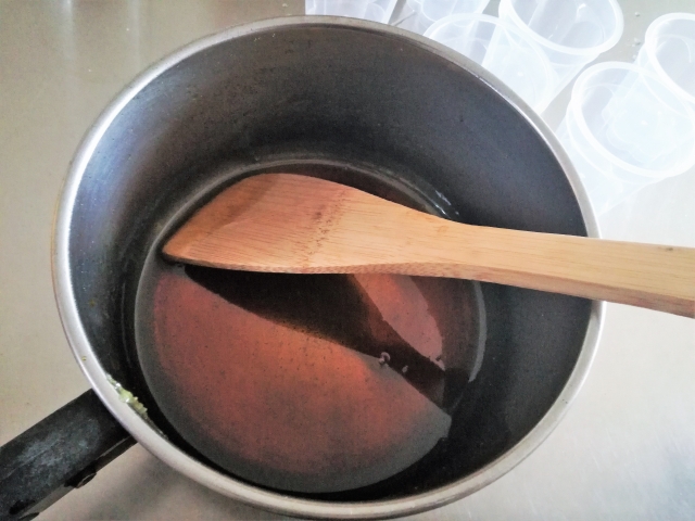 【3】濃い琥珀色になったら火を止めます。熱湯を加えて、固さを調整します。このとき、熱い液がはねるので、特に注意しましょう。