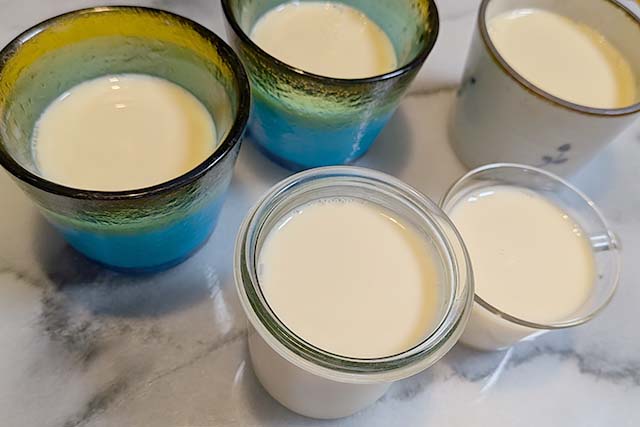 【4】こし器を通してプリン液をなめらかにしてから、器に等分に流し入れます。