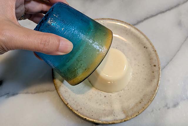 プリンが入った容器をお皿の上にひっくり返したら、そのままつるんと滑り落ちるのを待ちます。