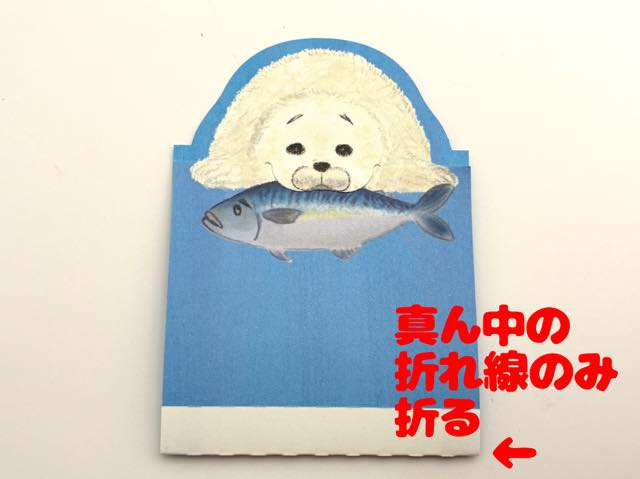 最初は束から剥がした状態でメッセージを書きます。メッセージを書いたら半分に折って、動物たちの口のあたりに開けられている切り込みに一番下の部分をはめ込むと、キャラクターたちの大好きな食べ物を「はむっ」と食べている姿になります。