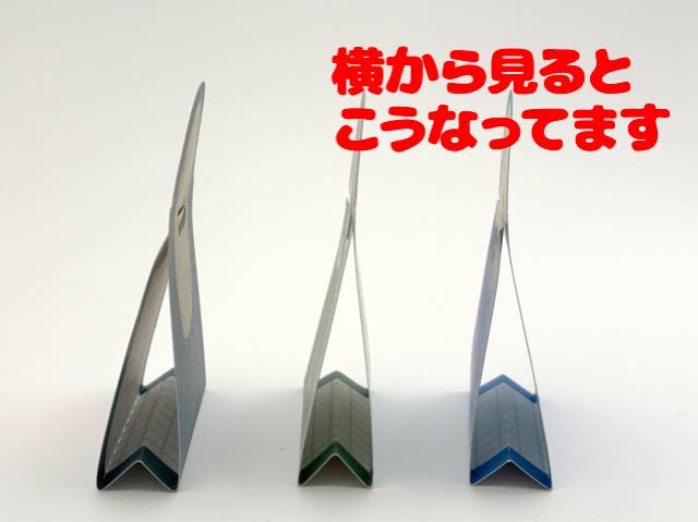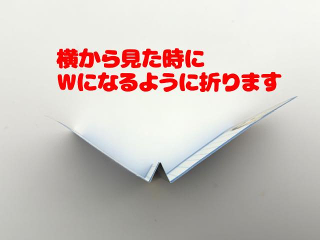 点線を上から谷折り・山折り・谷折りとすると、横から見ると折った部分が「W」の字のようになります。そして口の切り込みにはむっとすると、伝言が立つのです!