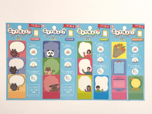 サクラクレパスが発売した伝言グッズは「立てて伝えるコミュニケーション付箋」です。バリエーションは4種類、それぞれに3〜4種類のデザインの付箋が付けられています。