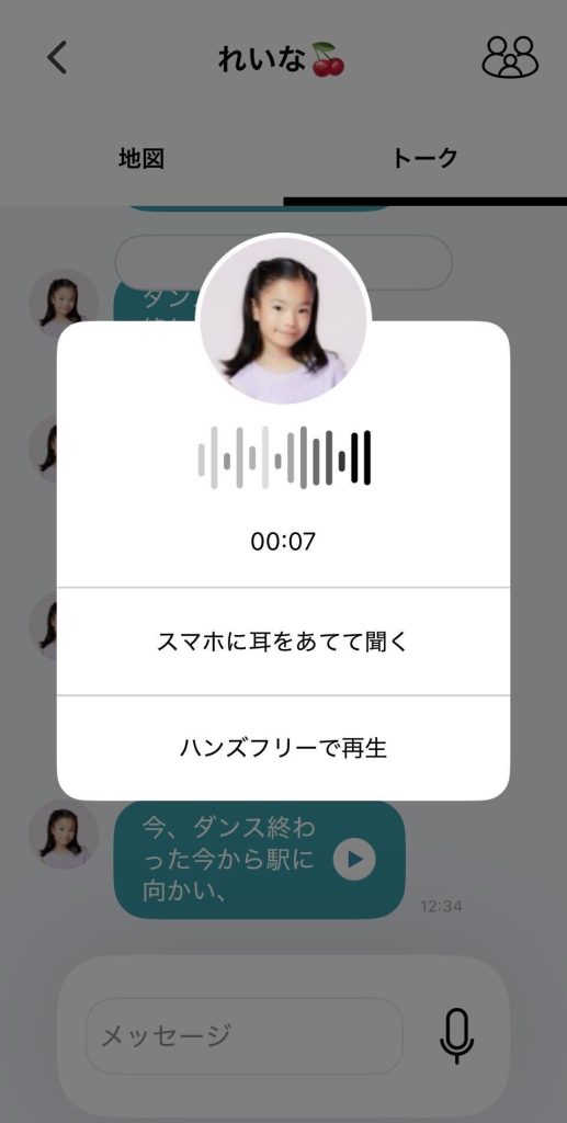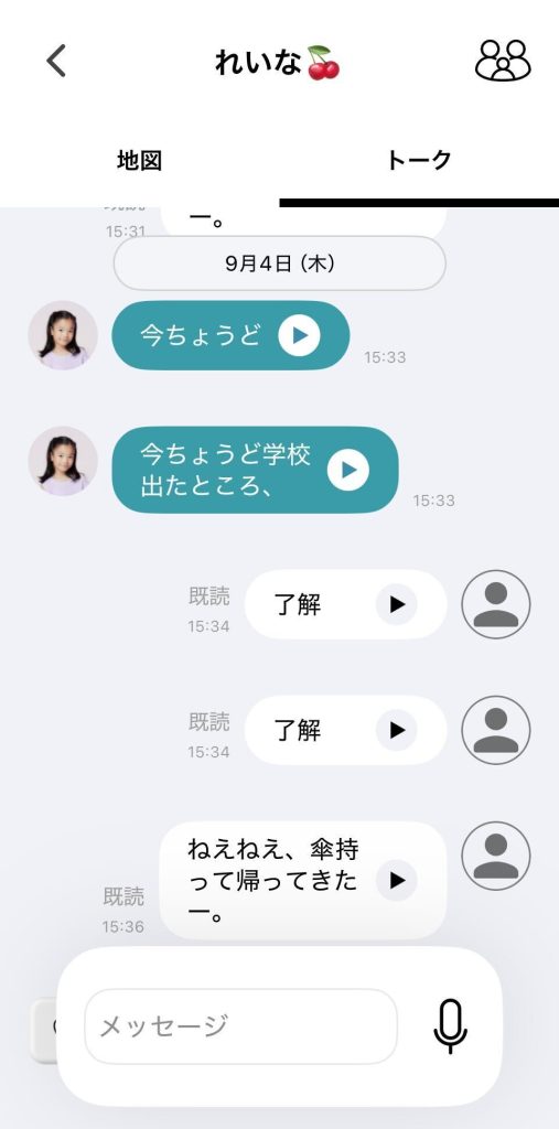 「今ちょうど学校出たところ」「ねえねえ、傘持って帰ってきた?」——そんな何気ないやりとりが、音声メッセージで届きます。