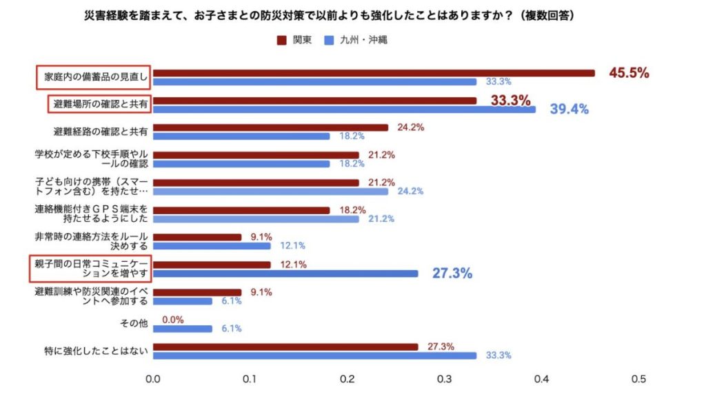 熊本地震を経験した九州地方では、震災を機に「子どもとのコミュニケーション」を増やした家庭が全国平均より約10%も高い結果に。被災体験が、家族の絆を見直すきっかけになっていることがわかります。