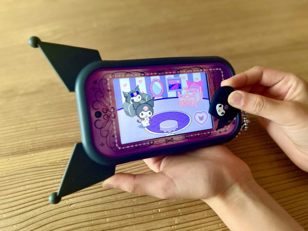 そして、何より特徴的なのが、クロミ型のカバーとマジカルチャームです。マジカルチャームは、実際にアプリの中でスマホをタッチをして遊ぶことができます。