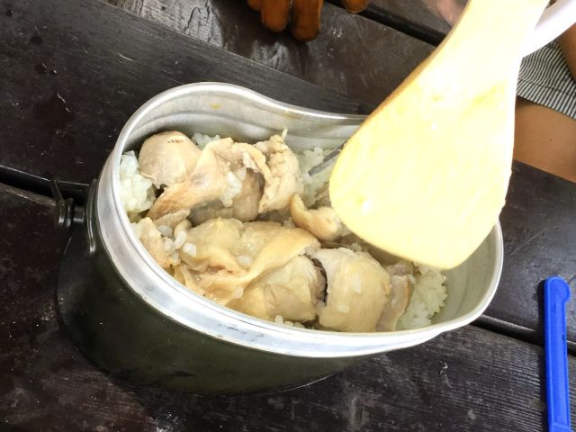 我が家ではキャンプ飯の定番になっています。飯ごうに鶏肉と調味料を入れて炊き上げるスタイルが、子どもたちのお気に入りです。