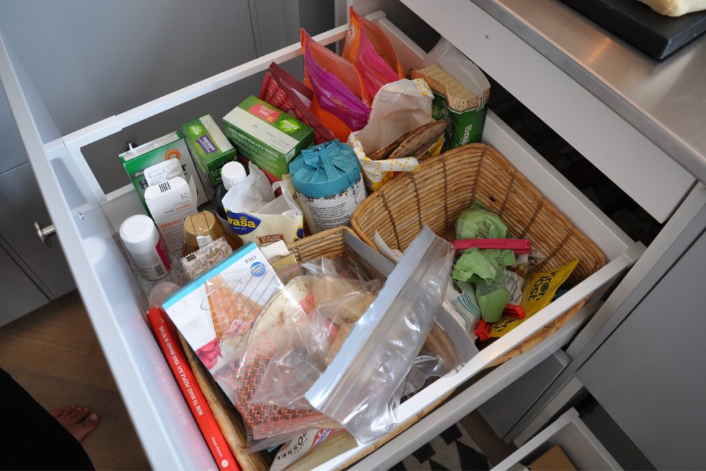 中をのぞかせてもらうと、コンセントやコード、使わない携帯電話や電池などが、雑多に入っています。これをはじめて見たときは、北欧の人たちにもこんな場所があったのか! と、ちょっとうれしくなったほどです(もちろん収納までこだわっている家もあります)。