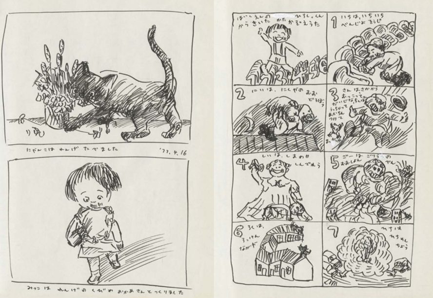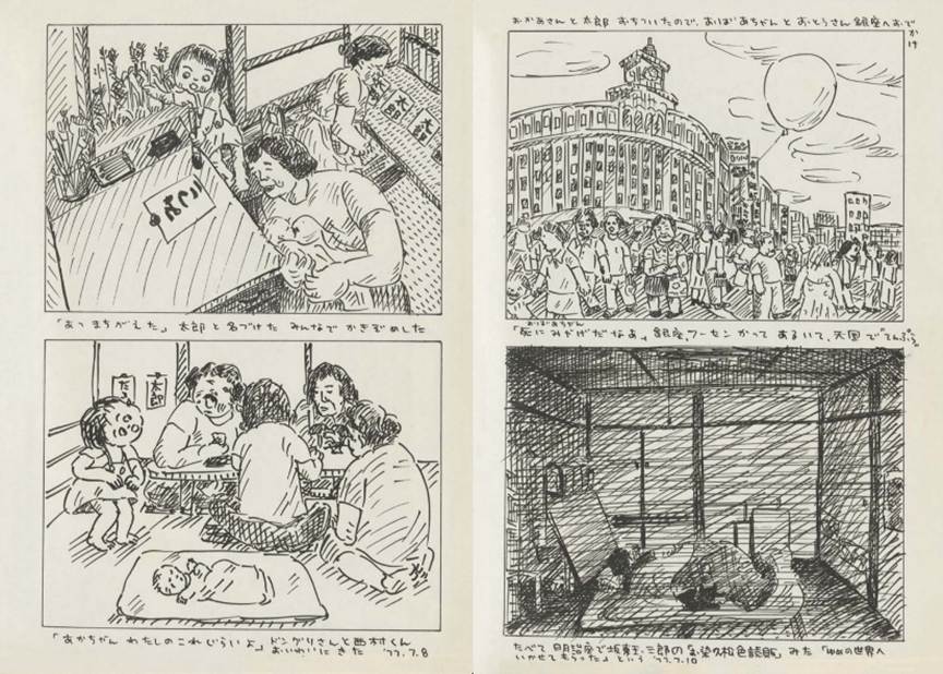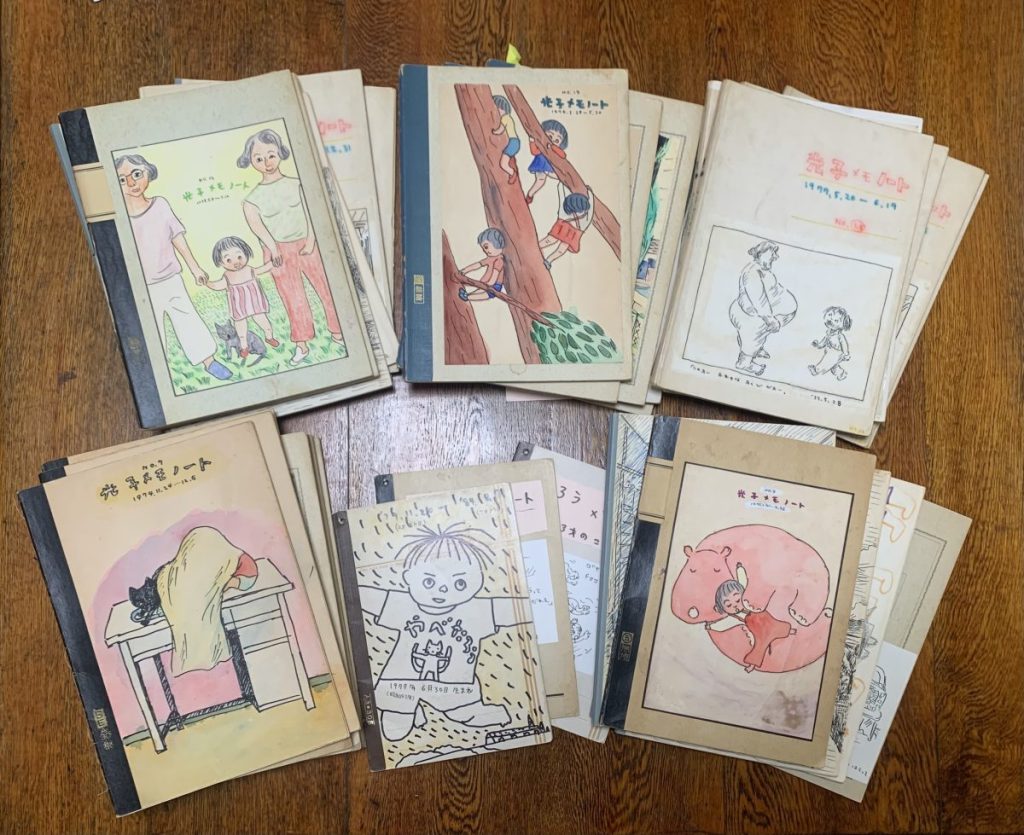 山吹さんが言及した家族絵日記は、みつのりさんが、ご長女の光子さんとその弟・太郎さんの成長を観察して綴ったものです。作家活動をする一方、家庭では家事と育児を担当し、いつも子どもたちの傍らにいたみつのりさんだからこそ描くことができたエピソードが満載で、子どもたちの日々の様子を、手描きの絵と少しの文章でノートに記録しています。