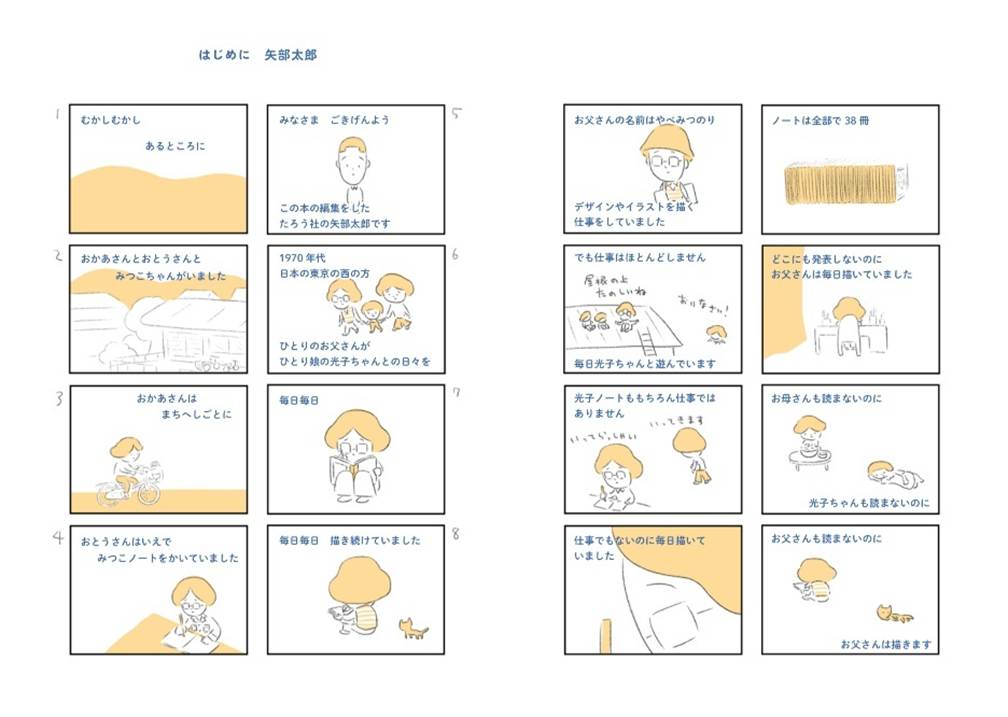 会場内で展示されているみつのりさんの家族絵日記のうち、太郎さんの姉・光子さんと過ごした日々を綴った38冊に及ぶ膨大な絵日記「光子メモノート」の全ページを、太郎さん自らがスキャニング&トリミング。その中から太郎さんが厳選して1冊にまとめたものです。なんと、その総ページ数は992ページにも及び、本の冒頭には太郎さんの書き下ろし解説漫画も載っています。
