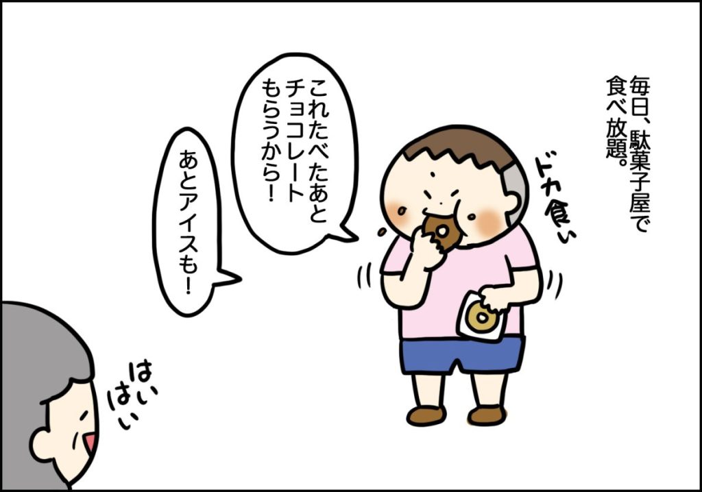 5歳頃に卵アレルギーが治り、食べられるものが増えたと言うこともあったそうですが、それにしても食べすぎ…! 太ったのとアレルギー完治は関係ないですね。毎日お菓子三昧だと、1ヶ月でこんなに太るんだ、と親も先生もびっくりしたそうです。夫自身も、人生でこの夏休みのことは印象強く記憶に残ってると言ってました。