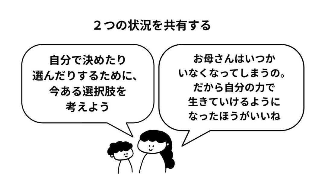 一つは「状況を共有する」こと。具体的には「いつかは親が亡くなり、自分の力で生きなければならなくなること」と「今ある選択肢」についての情報共有です。