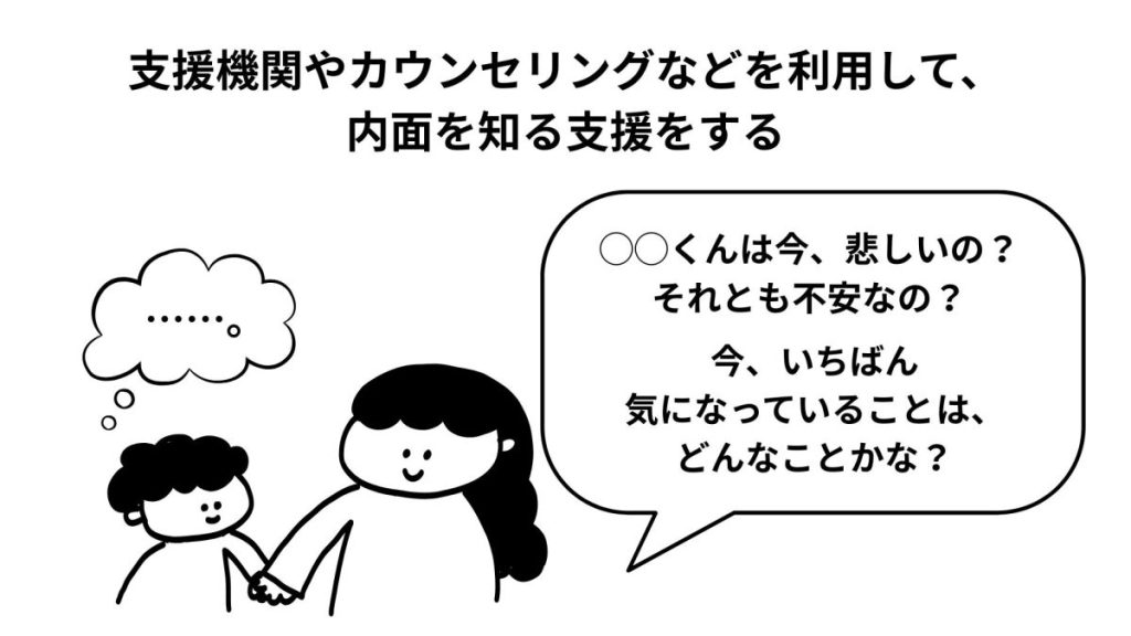 そのためには子ども自身が「どのように感じているのか」「どのような価値観を持っているのか」に、向き合うことになるのですが、子どもは自分の内面を知るための言葉を持ち合わせていません。言葉を通じて、自身の内面を知るための支援を、支援機関やカウンセリングなどを利用しながら行っていくのです。