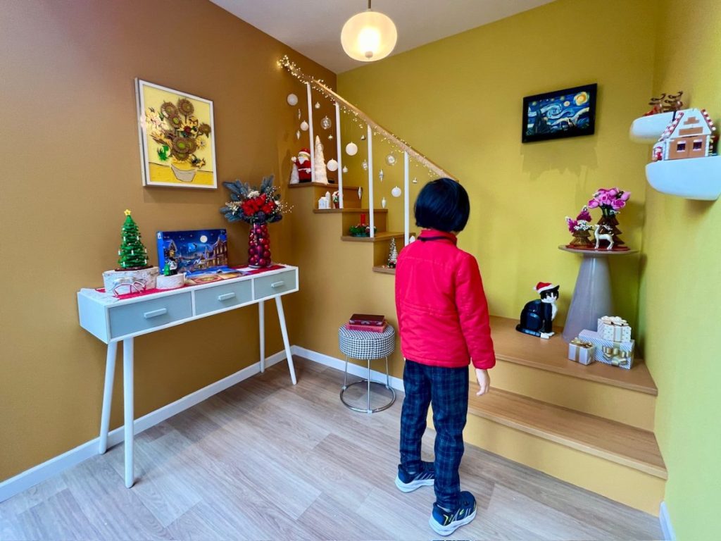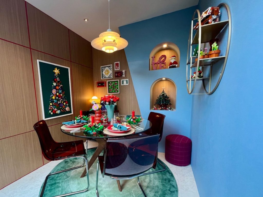おもちゃのブロックで飾り付けしたとは思えない、華やかなダイニング空間。特に、レゴ®ブロックを貼り付けて額装し、壁にデコレーションするクリスマスツリーが印象的でした! 場所を取らず飾れるので、真似したいと思います。
