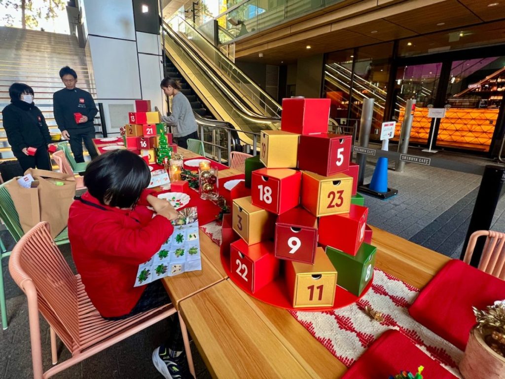 テーブルにあるクリスマスギフトに見立てたボックスの中にレゴ®ブロックのセットが入っています。どんなセットが当たるかは、開けてからのお楽しみ。息子はクリスマスツリー、筆者はサンタが入っていました。