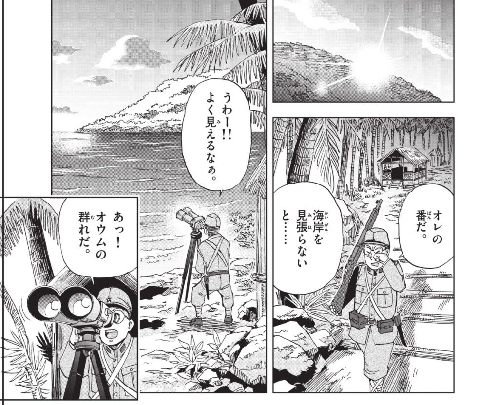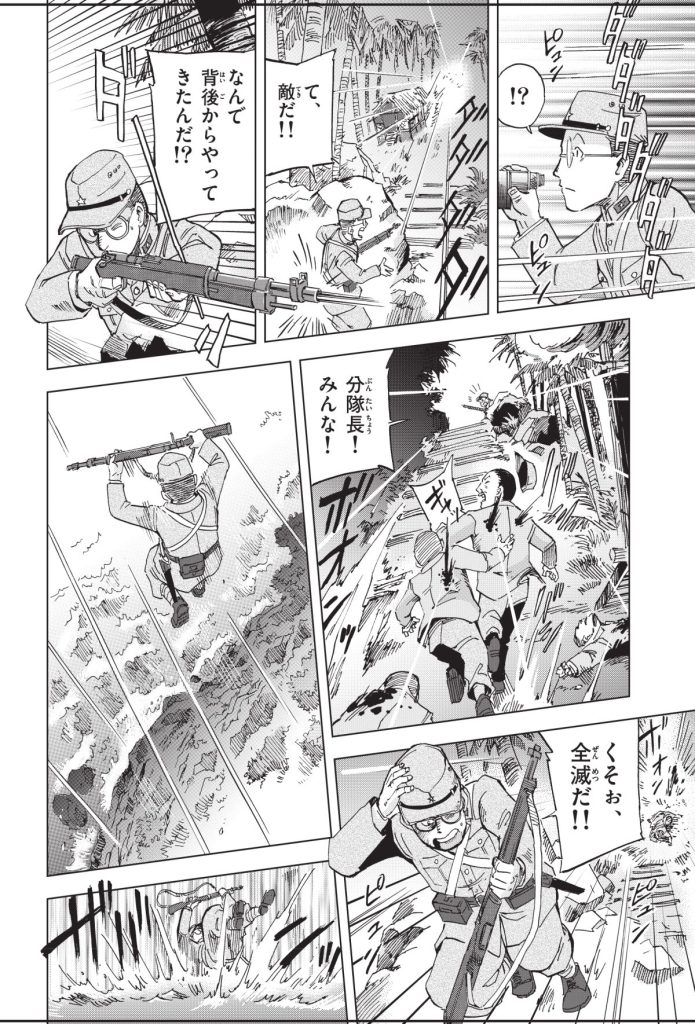 正確に言うと、しげるが見張りの番のとき、背後から敵が襲ってきたため逆に助かりました。本隊から派遣された分隊は全滅しましたが、ジャングルをさまよいながら5日間かけて、日本の本隊のもとへ戻ります。