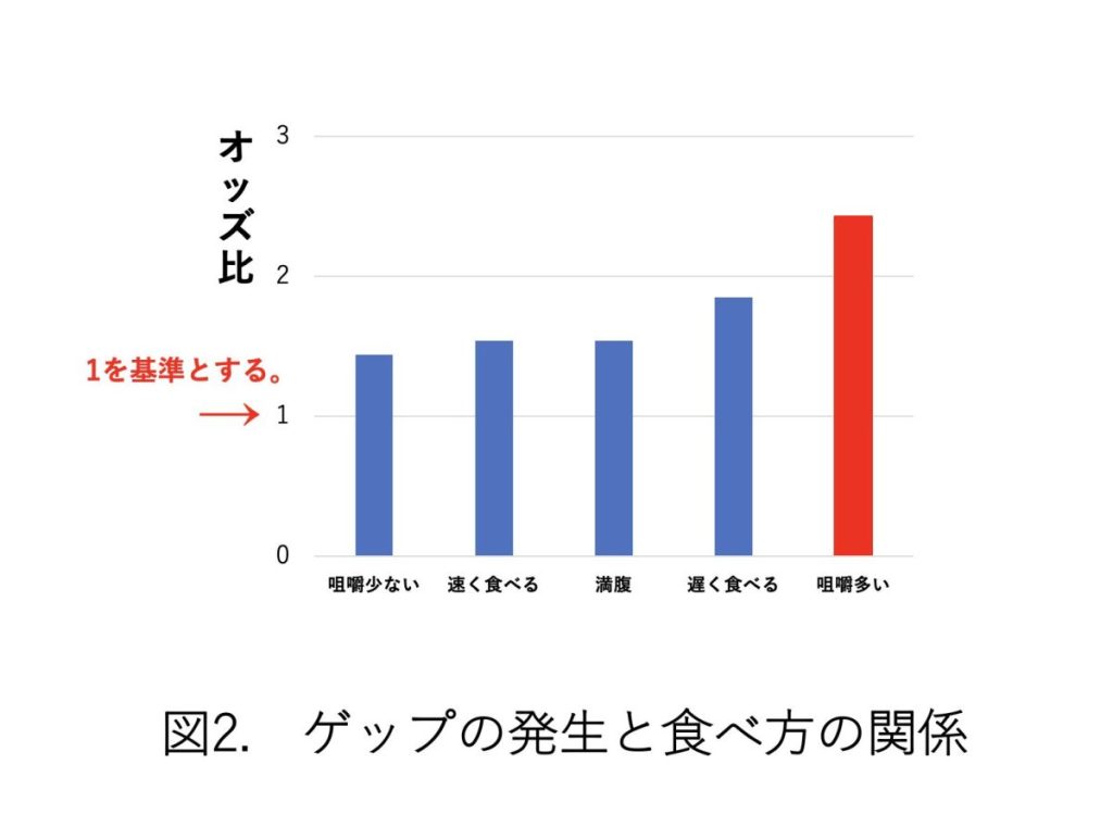 また、満腹まで食べる、咀嚼回数が極端に少ない、または多いといった食事の習慣がゲップ障害の発症に大きく関連することも判明しました(下の図2)。