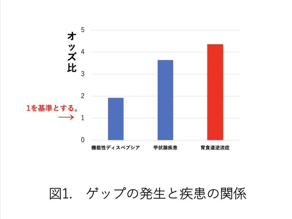 また、ゲップ障害が消化器疾患などの有無(胃食道逆流症、機能性ディスペプシア、甲状腺疾患)と関係することが明らかになりました。(下の図1)