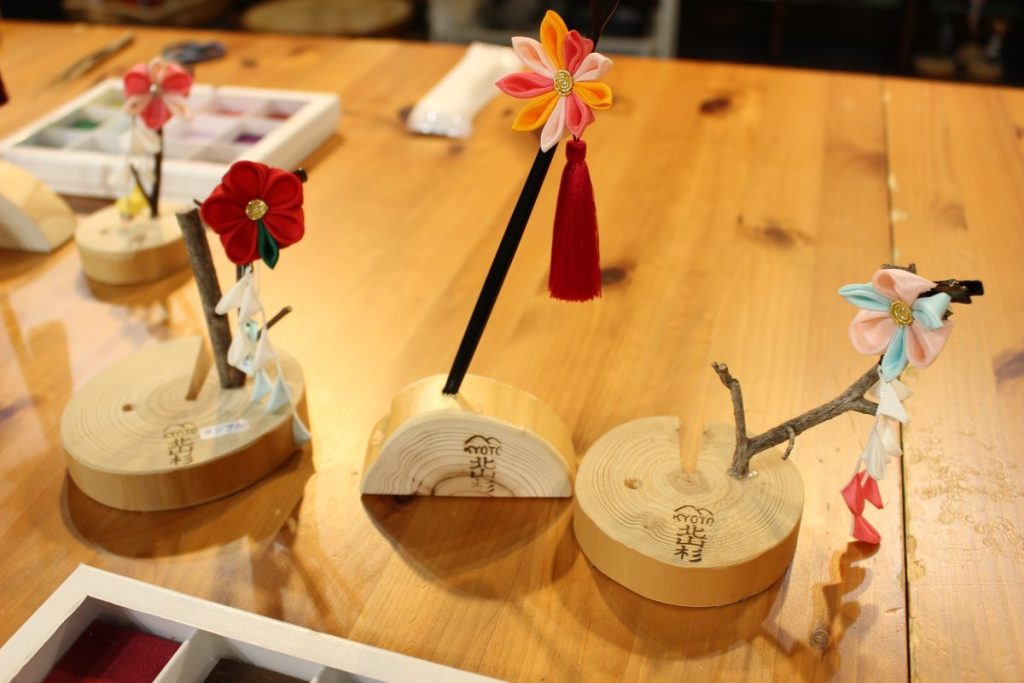 オリジナルのつまみ細工の完成です! 北山杉で作られた台も付いてくるので、インテリアにもなります。