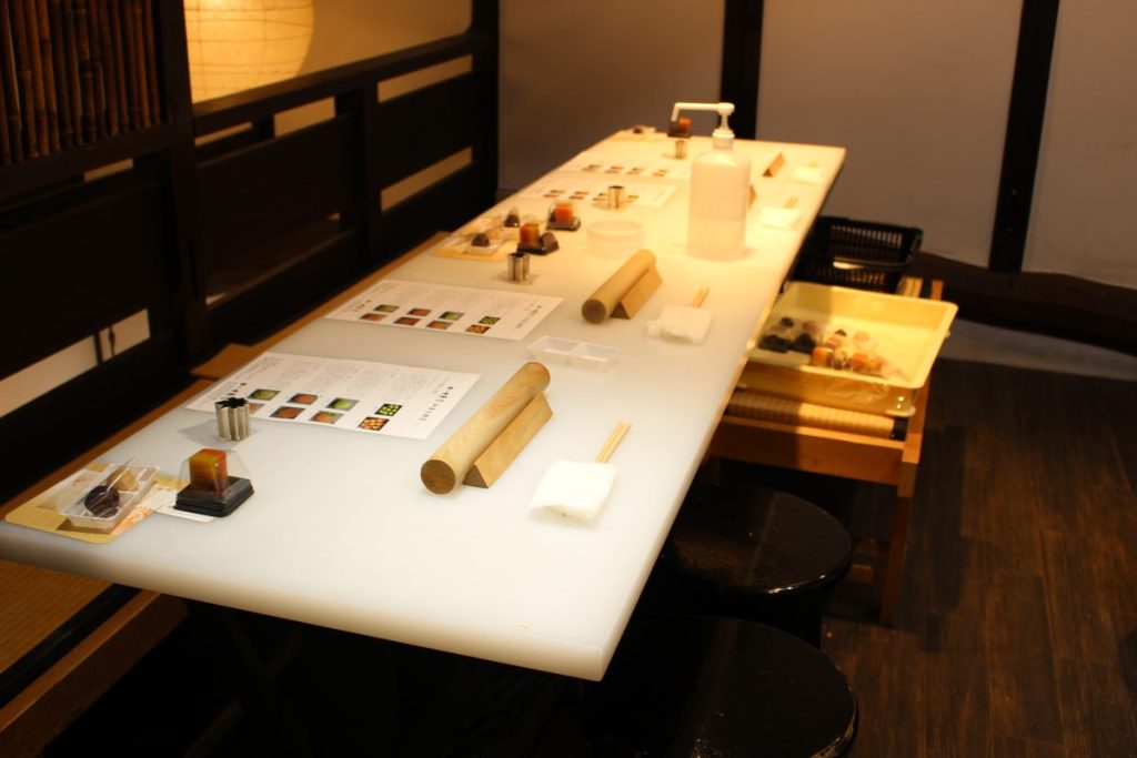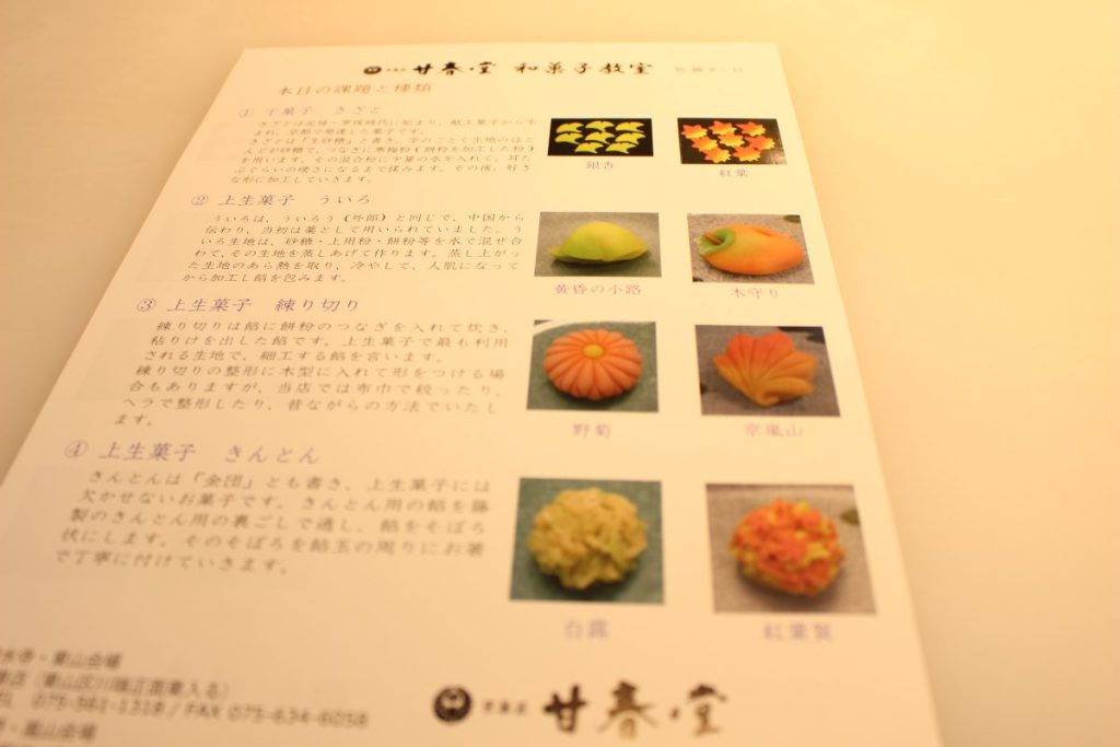 綺麗に手を洗い、和菓子教室スタートです。席に着くと、資料や材料がセッティングされています。部屋には教えてくれる職人さんの手元が大きく映し出されるモニターもあるので、作業がとてもわかりやすいです。