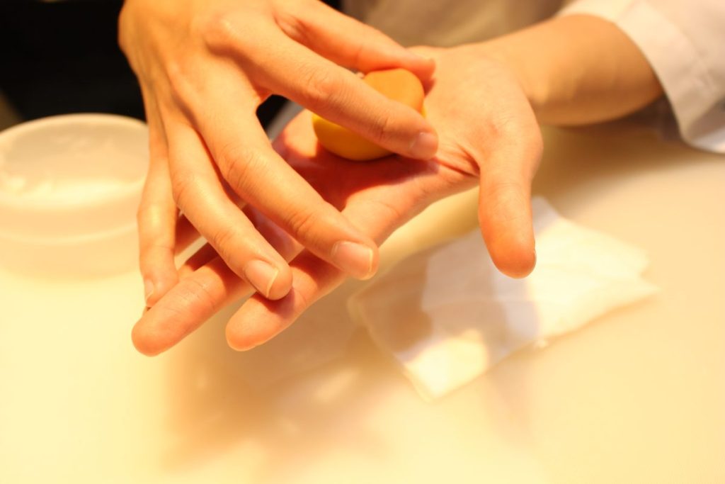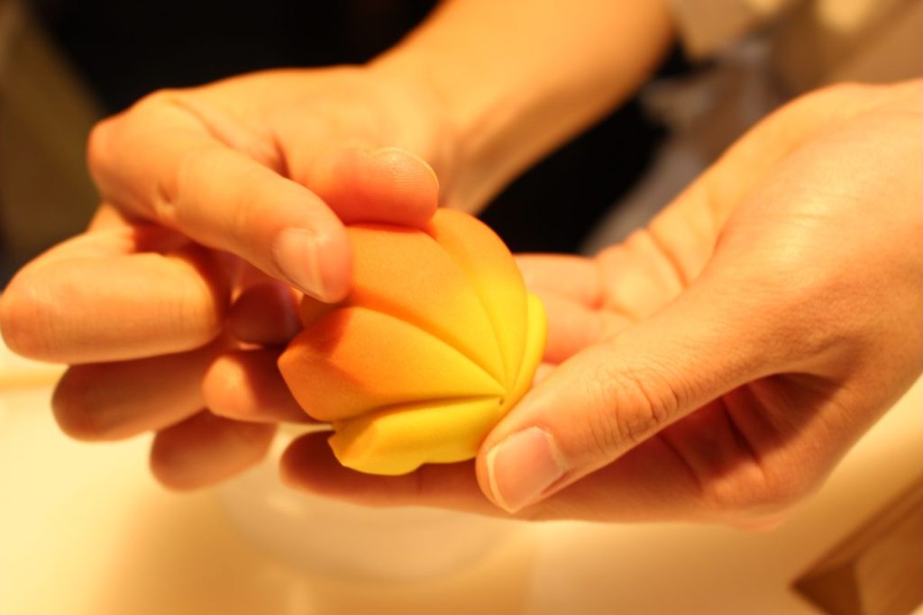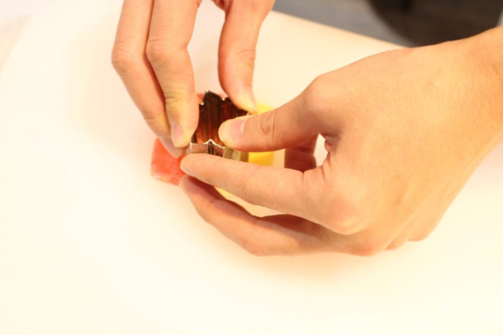 そして、次は最も難しいとされる、練り切りです。練り切りは、粘り気を出した餡を手やヘラを使って形成していきます。指先で色のグラデーションを作ったり、模様を入れたり繊細な作業です。
