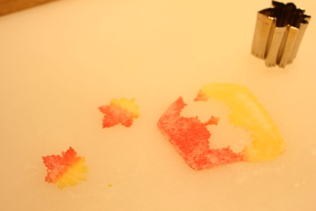 ヘラや指先を使って紅葉の葉を作ります。色がとっても綺麗ですね。