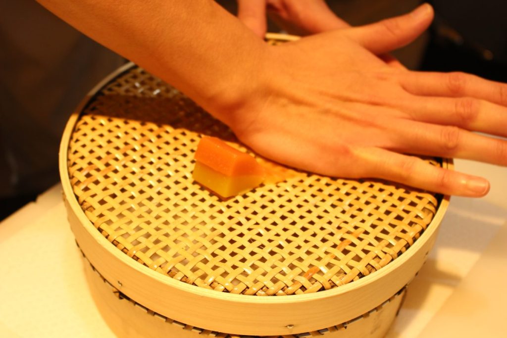 次にチャレンジするのは「ういろ」です。生地を伸ばし、餡を包んでいきます。今回は秋なので、渋柿のういろです。