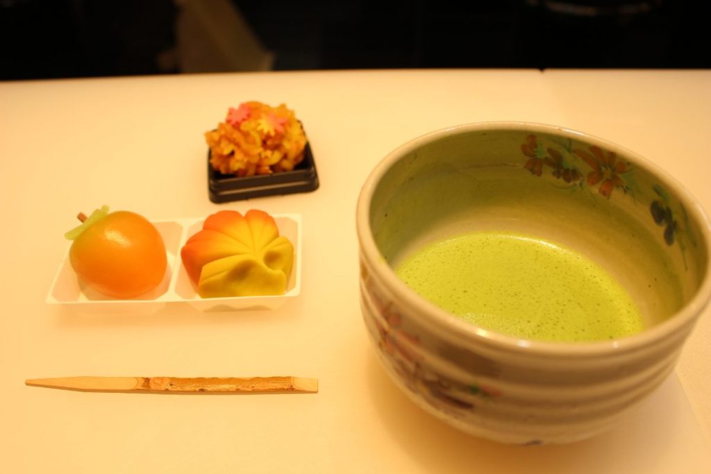 和菓子が作れたら、抹茶をいただけます。抹茶と一緒に、出来上がったお菓子を食べることもできますし、持ち帰り用の箱も用意してくれているので、持ち帰ってもOKです。