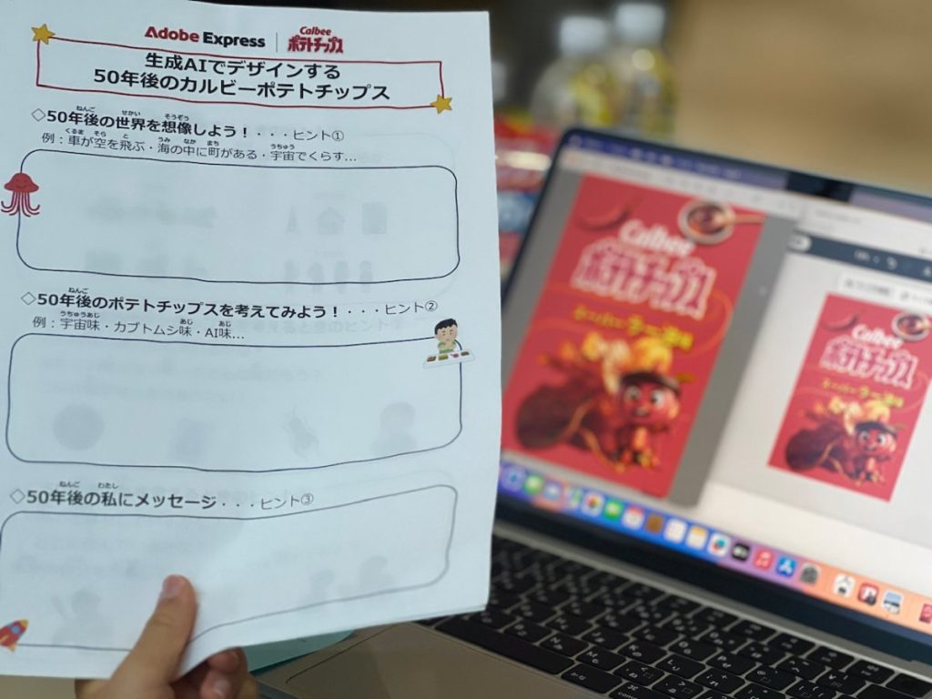 アドビの画像生成AIを搭載したデザイン制作アプリ 「Adobe Express(アドビ エクスプレス)」 を活用し、「カルビーポテトチップス」専用の特別パッケージテンプレートを使って、親子で「50年後のカルビーポテトチップスの味とパッケージデザイン」を自由に創作します。