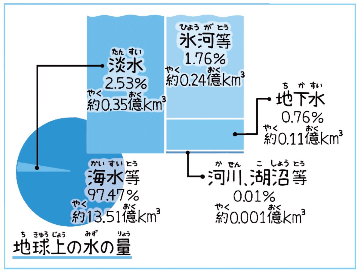 まず、いちばん多いのが氷河・氷床・雪など氷の状態になっているもので、淡水の約70%を占めている。残りのほとんどは地下水として地面の下にあって、他にも水蒸気として空気 中をただよっているものや、空にうかぶ雲などがある。そして、キミたち人間をはじめ、生きものの体の中にも水はあるんだよ。