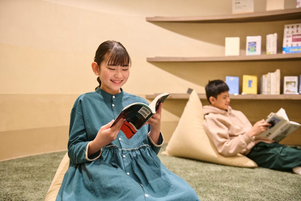 シンボルツリー「感性の樹」の周りには、約1000冊の本がずらり。懐かしい本、初めて見る本、ピンと来たら手に取って、座ったり寝転んだりしながら読むことができます。お子さんがアクティビティに参加している間、大人たちのリフレッシュタイムにもおすすめ。