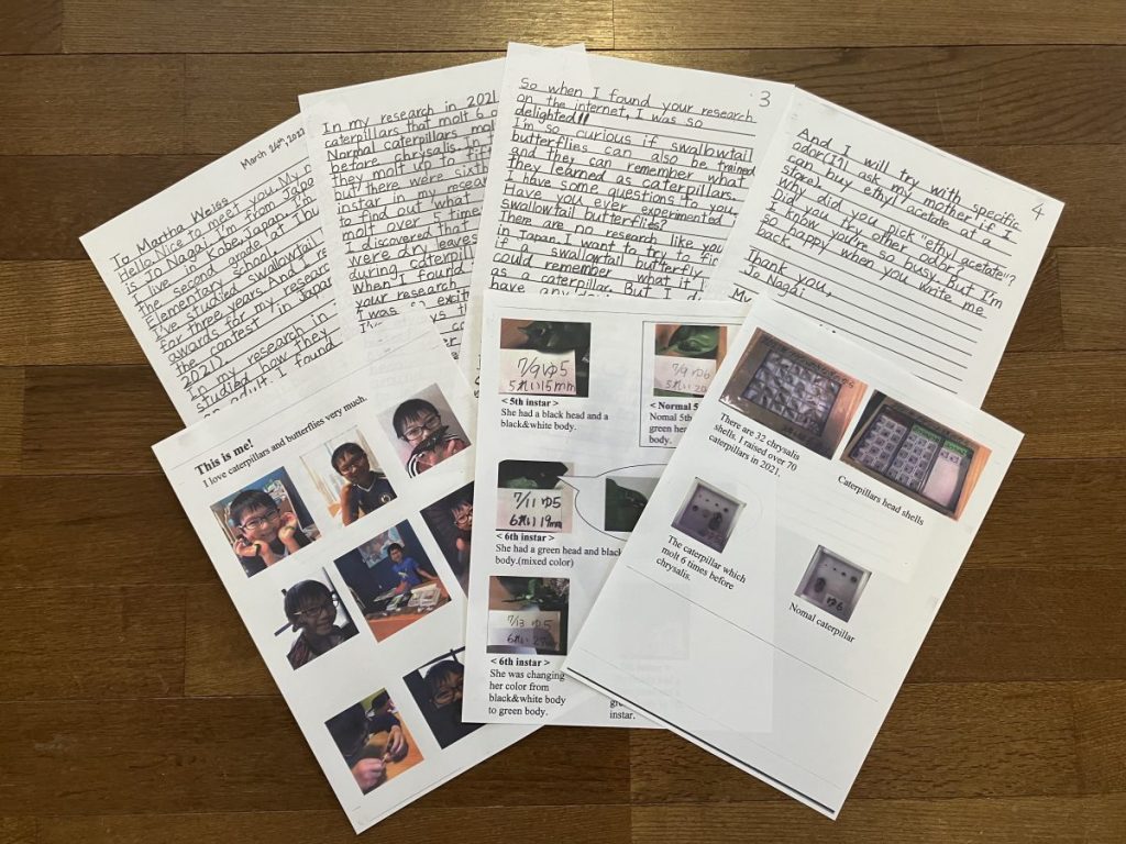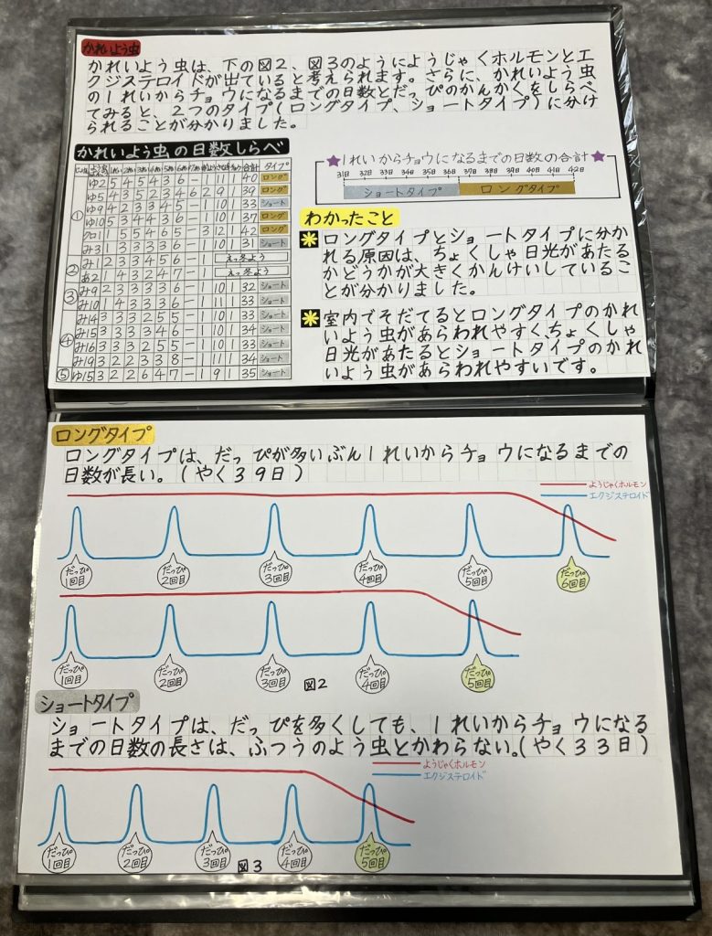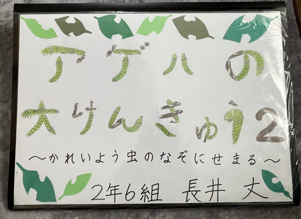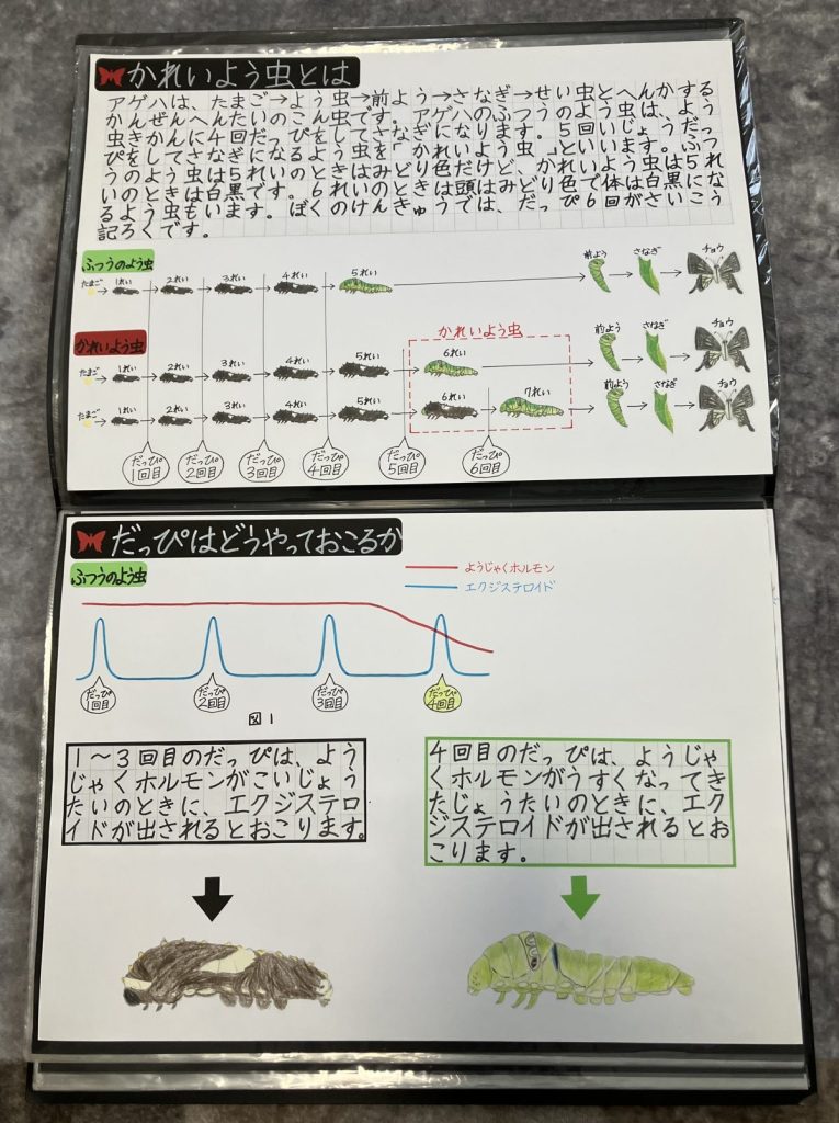 2年生のときは、普通の幼虫より脱皮の回数が多い個体について調べて「アゲハの過齢幼虫の大発見」として研究にまとめました。