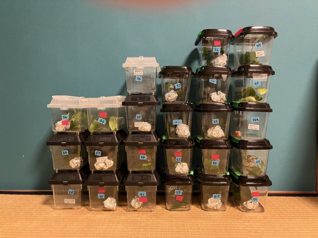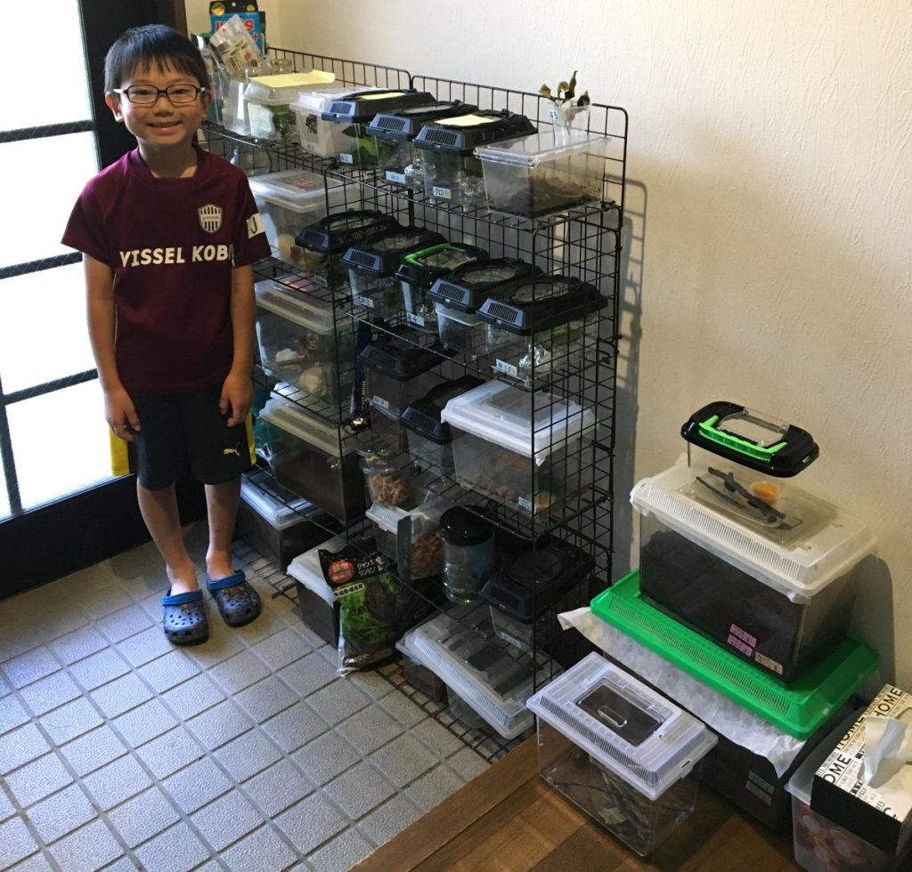 お母さま:はい(笑)。幼虫のうちは虫かごで一匹ずつ管理しなければなりません。夏場は50匹、100匹と増えることもあり、虫かごが子ども部屋だけではとても収まりきらず、玄関や廊下にまで並ぶことも。成虫になると、部屋の中に大きな飼育用テントを張って管理します。研究に必要なものだと理解して、家族みんなで工夫しながら支えています。