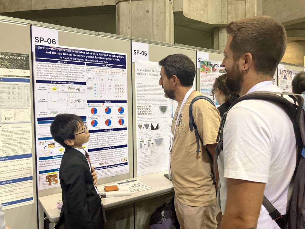 長井くん: ありがとうございます!小学2年生のときに、いつもお世話になっている伊丹市昆虫館の学芸員さんから「学会で発表してみたら?」と言っていただき、小学3年生のときに信州大学で初めて学会発表をしました。そこでの発表を聞きに来てくださった ICE2024KYOTOの委員長の先生から、国際昆虫学会議でも発表してみたらとすすめていただき、小学5年生のときに初めて英語でポスター発表に挑戦しました。