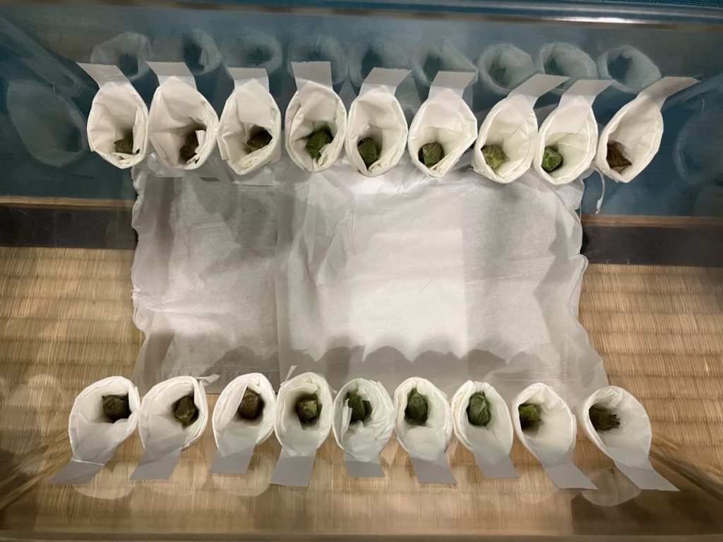 蛹(さなぎ)を入れたカップはティッシュペーパーで一つひとつ手作り
