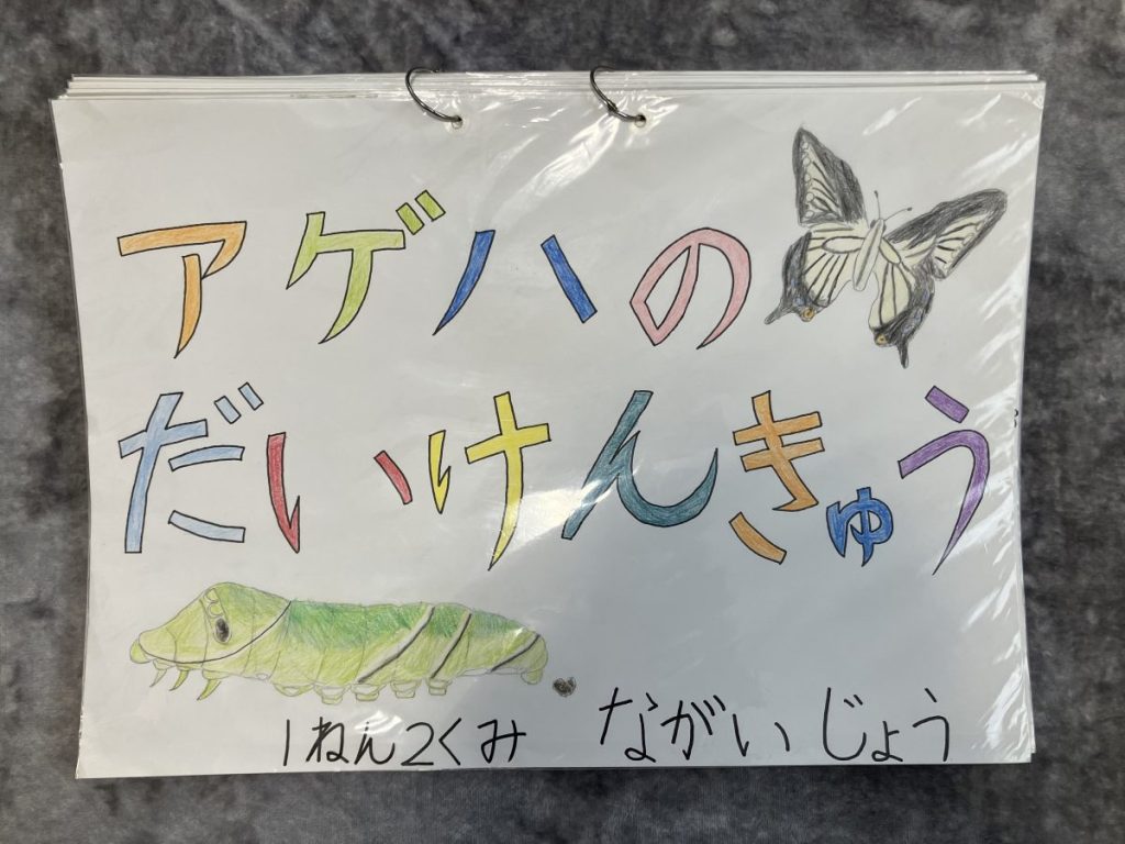 1年生のときは、アゲハ蝶を羽化させて成虫になるまでの記録を「ぼくとチョウの35日間」にまとめました。