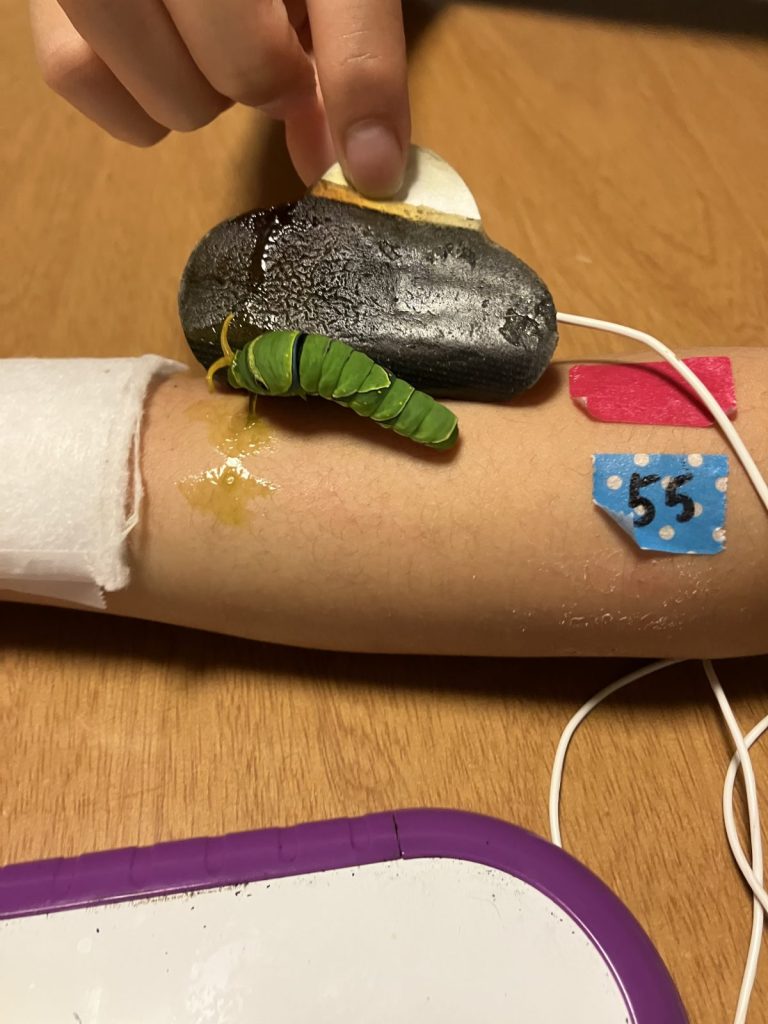 長井くん: まず約100匹の幼虫を孵化(ふか)させました。そのうち半分の幼虫に、ラベンダーの香りを嗅がせながら、低周波治療器で電流を流します。3秒ほどで幼虫は嘔吐してしまうのでかわいそうなのですが、「ラベンダーの香り=嫌なことが起きる」と覚えてもらうために、1日3回、毎日繰り返しました。