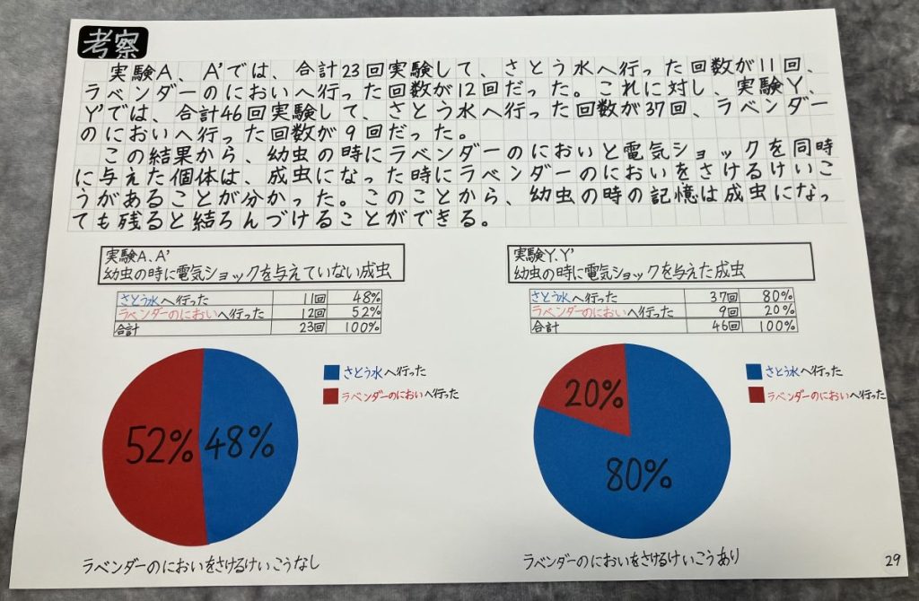 長井くん: 「ICE2024 KYOTO」は英語での発表なので、母と毎日練習しました。前の研究に加えて、電流を流した幼虫が成虫になって産んだ子ども、その孫の世代まで調べました。すると、子も孫もラベンダーの香りを嫌がる傾向を示したんです。「もしかして、記憶が遺伝しているのでは?」という最初のモヤモヤが、データとして形になっていくのが嬉しかったです。
