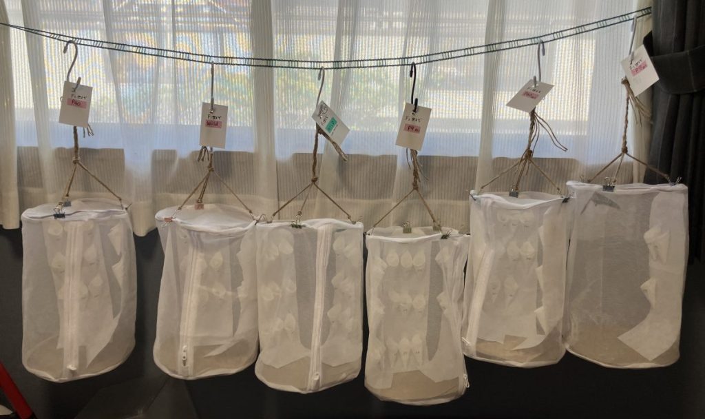 蛹(さなぎ)のティッシュカップを入れたネットのカゴがズラリ! 計画通りにいかないことも多く、生き物の実験は苦労の連続