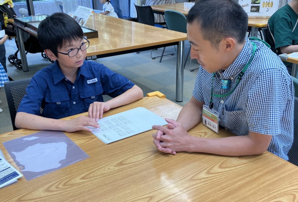 伊丹市昆虫館の学芸員さんに質問をする丈くん