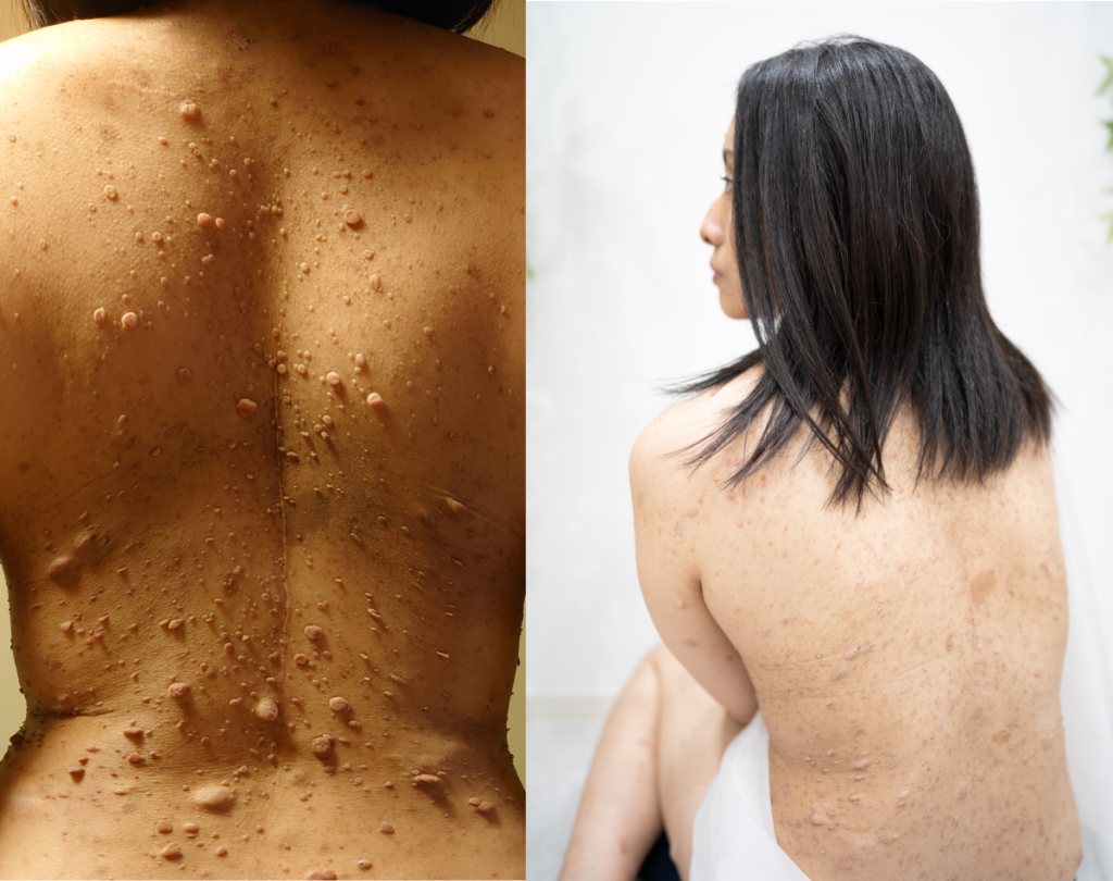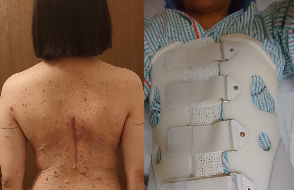 会っていろいろ話す中で、「最近腰痛がひどい」という話をしたら、「病院に行っているの?」と聞かれました。高校生のときに診断してもらって以来一度も行っていないと答えたんですよね。当時、医師に「カフェオレ斑はレーザーで消せるけれど色素が薄くなるだけだよ、 ブツブツも取っても増えるから意味がない」と言われてしまって。それに、腰痛は病気とは関係ないだろうと思い込んでいました。