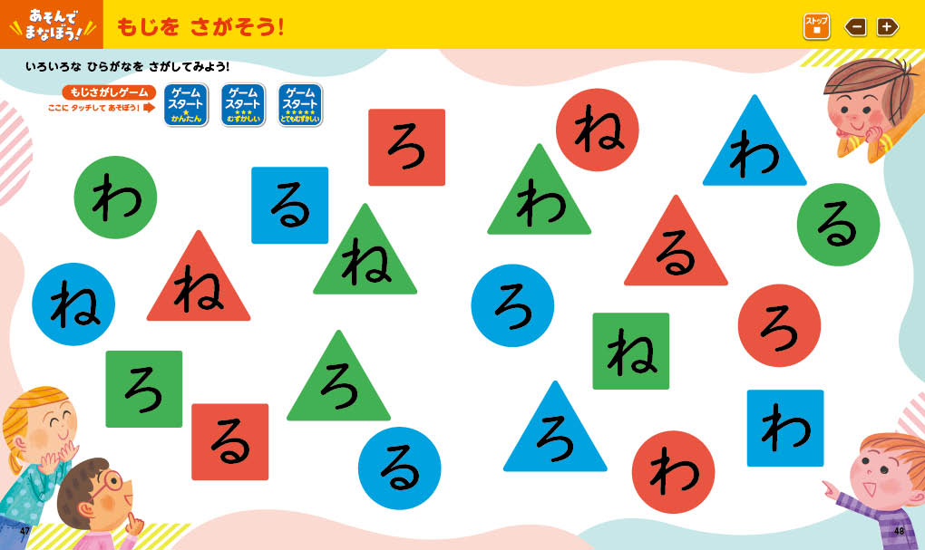 各ひらがなページの〔どれかな? クイズ〕も合わせるとゲームが大充実。お子さんの一人遊び時間にも、家族やお友だちと一緒に遊ぶ時間にも楽しめるように工夫しています。